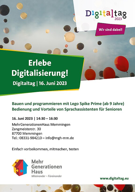Das Mehrgenerationenhaus Memmingen beteiligt sich am bundesweiten Digitaltag, der am Freitag, 16. Juni, stattfindet. Von 14.30 Uhr bis 16.30 Uhr können Kinder ab 9 Jahren Lego-Robotik mit Lego Spike Prime ausprobieren. Außerdem können sich Seniorinnen und Senioren über den Einsatz und die Vorteile von Sprachassistenten informieren und sie testen.