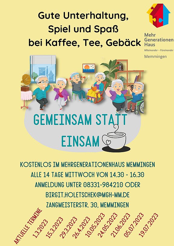 Am Mittwoch, 1.3.2023 startet ein neues Angebot im MehrGenerationenHaus Memmingen. Bei "Gemeinsam statt einsam" trifft man sich gemütlich bei Kaffee, Tee und Gebäck zum gemeinsamen Reden, Spielen, Basteln, Musizieren.