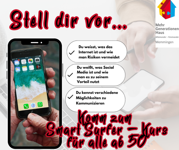 Die Kurse nach dem Konzept „Smart Surfer – Fit im digitalen Alltag“ unterstützen die Kursteilnehmenden dabei, einen selbstbewussten und sicheren Umgang mit dem Internet zu erlernen. Die Seminarreihe richtet sich an ältere Menschen, die bereits Computer und Internet nutzen und gerne mehr zu beiden Themen wissen möchten. Im Laufe der Kursreihe lernen die Teilnehmer*innen, wie man gezielt Informationen im Daten-Dschungel findet, Kontakte über das Internet pflegt und keine Angst mehr vor dem Online-Einkauf haben muss. Der gesamte Kurs umfasst zwölf Module an 5 Nachmittagen (24.10., 31.10., 14.11., 28.11., 5.12., jeweils von 14.30 - 17.30 Uhr